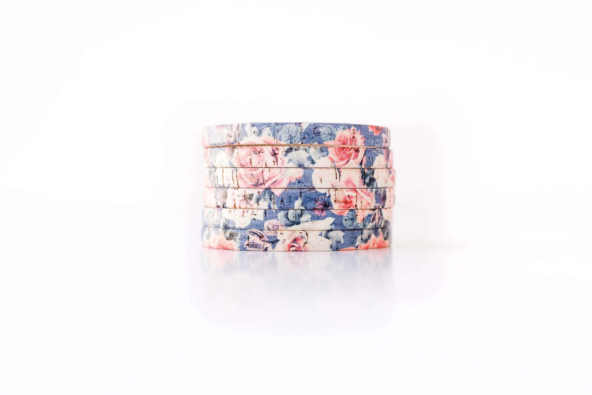 Leather Bracelet / Original Sliced Cuff / Pink Roses Cork / Small