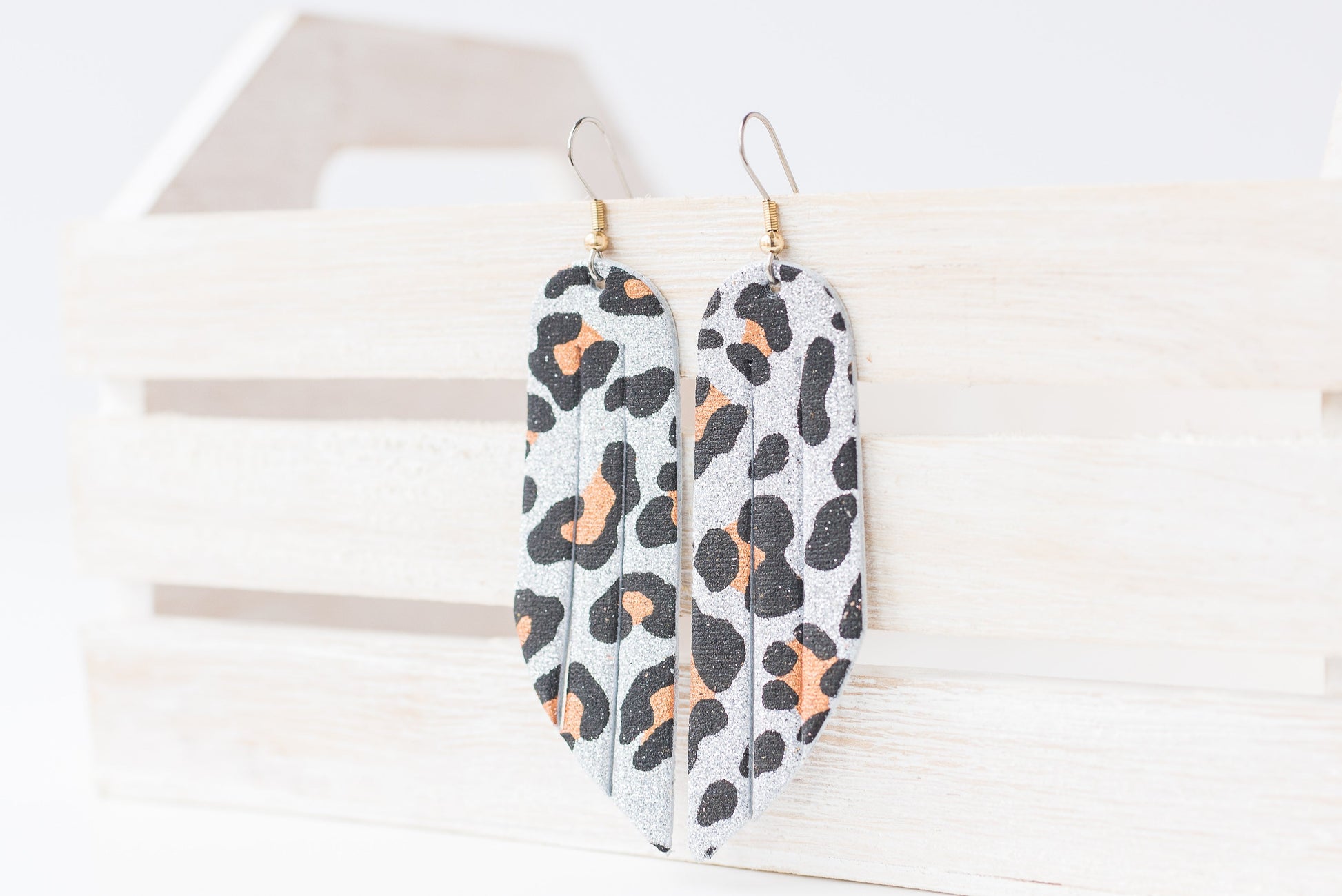 Leather Earrings / Fringe / Sparkle Leopard Silver