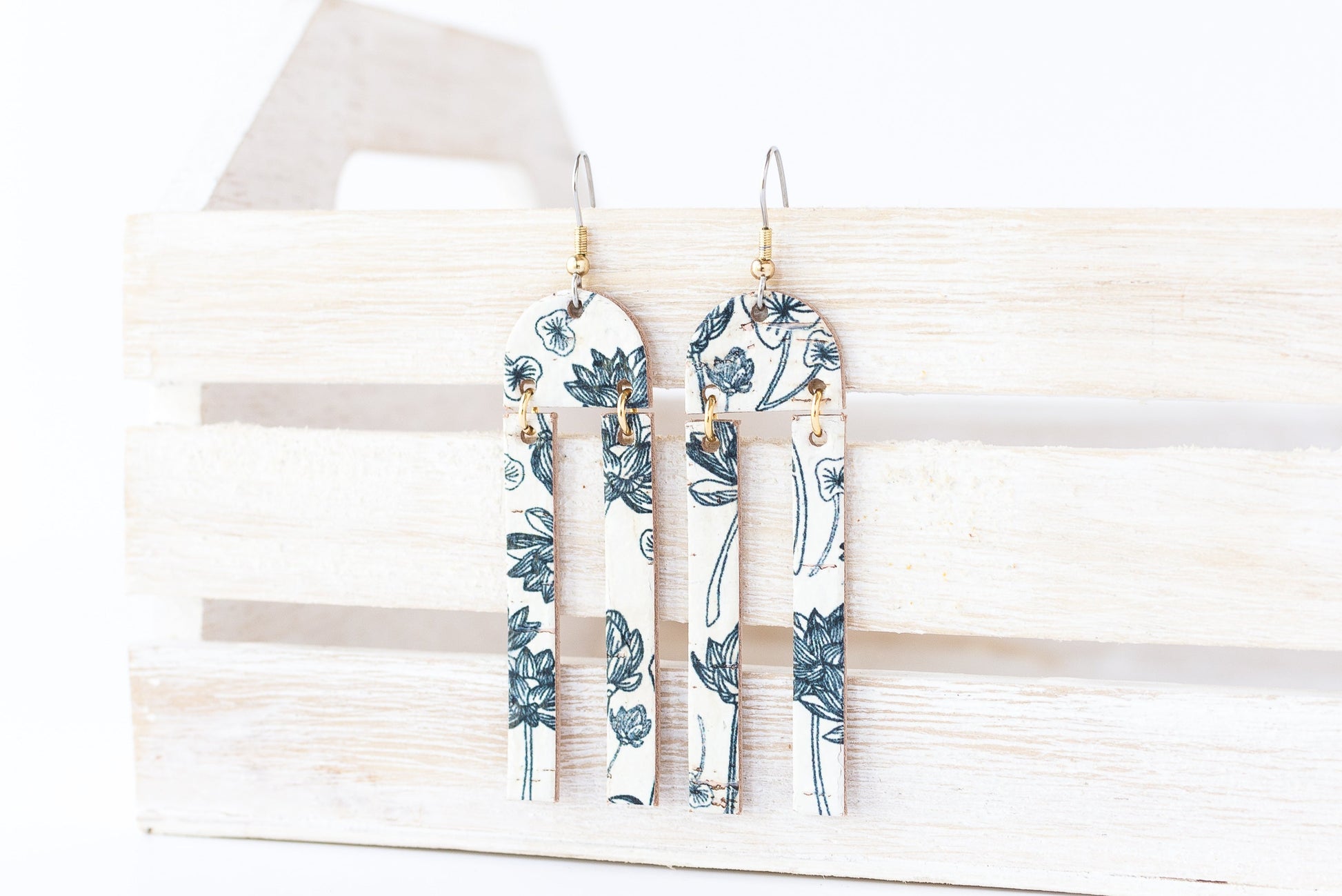 These striking geometric earrings combine a unique 3-piece design with leather to make a beautiful statement!